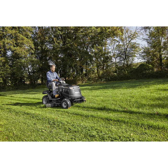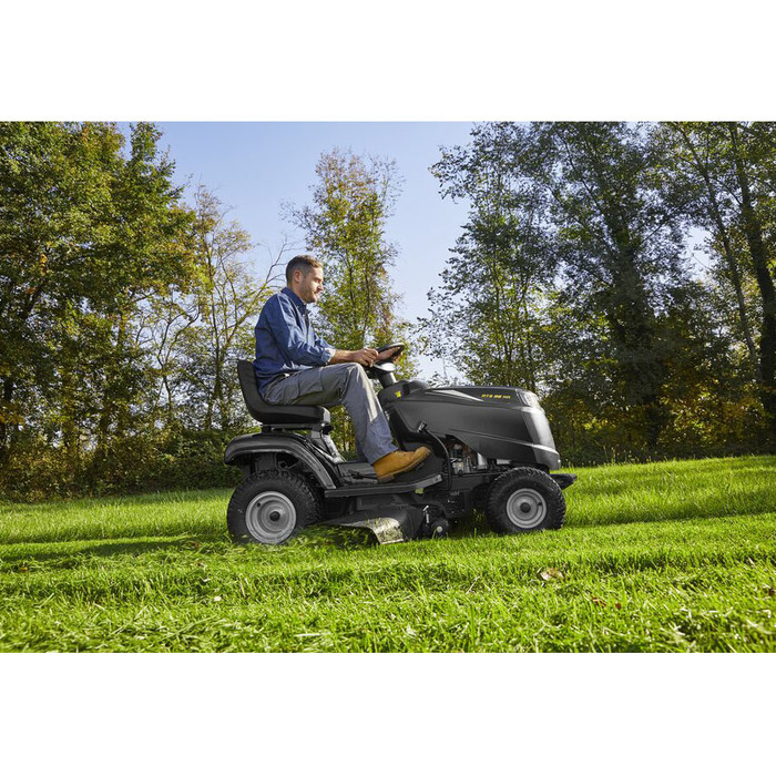De Alpina AT3 98 HA is een compacte gazontractor met zij-uitworp en maakt gazononderhoud leuk dankzij zijn snelheid tot 8,8 km/u in combinatie met de comfortabele hydrostatische transmissie. Dit maakt het gemakkelijk om gazons dicht bij stenen of randen te maaien. Het middelpunt van de AT3 98 HA is de ST 400 motor (Powered by Stiga), die indruk maakt met een vermogen van 7,1 kW/9,6 pk bij 2.800 tpm en een cilinderinhoud van 414 cm³. De maaier is uitgerust met twee contraroterende dubbele messen en kan gemakkelijk worden ingeschakeld via de elektromagnetische koppeling. Er is een maaibreedte van 98 cm beschikbaar, waarvan de maaihoogte in 7 stappen kan worden ingesteld van 25 mm tot 80 mm. De jockeywielen zorgen er altijd voor dat de maaier de grond niet raakt.