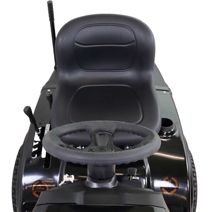 Daarvoor zorgen de soepel lopende bedieningselementen van de zitmaaier – bijvoorbeeld de geveerde, comfortabele bestuurdersstoel met hoge rugleuning, waarvan u de zitpositie kunt aanpassen aan uw lichaamslengte. Vanaf de bestuurdersstoel hebt u een overzicht van alle belangrijke functies van de machine en kunt u gemakkelijk de maaihoogteverstelling of de messchakelaar naast de bestuurdersstoel bedienen.
